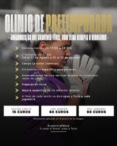 El CDE Academia Fénix informa que ya están abiertas las inscripciones para el Clinic de Pretemporada que se celebrará durante el mes de agosto. Esta actividad está dirigida a futbolistas que deseen prepararse de forma óptima para el inicio de la nueva temporada, con sesiones de alto nivel, metodología profesional y una planificación orientada al máximo rendimiento individual.